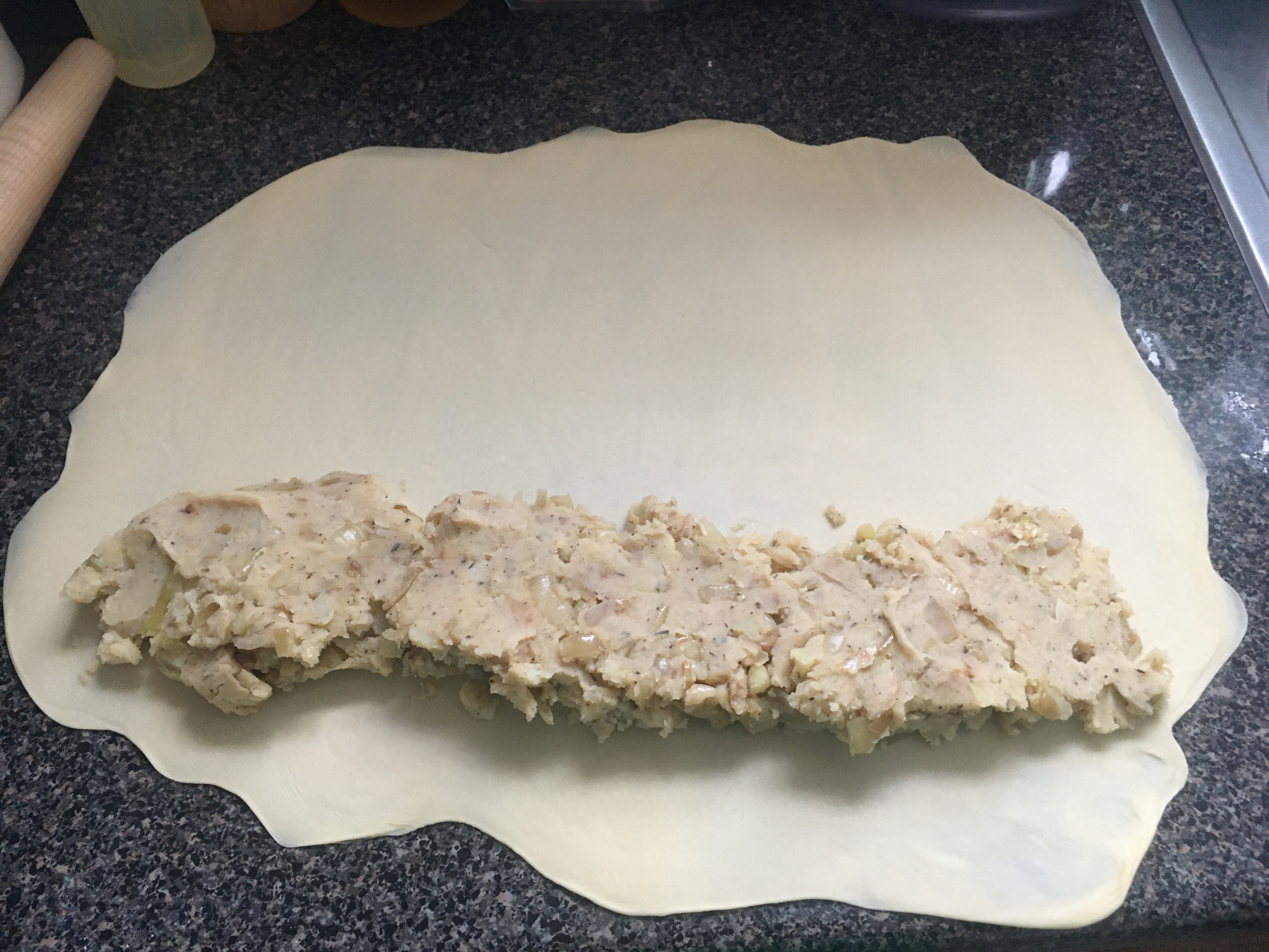 - Put the filling onto the dough a couple of inches away from the longer side. The filling should be in the shape of a log.